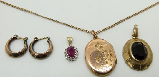 Victorian 9ct gold back and front locket on a yellow metal chain, an 9ct gold pendant, 9ct gold earrings and a pendant set with a pink sapphire and diamonds