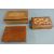 Two parquetry inlaid boxes, width of larger 25cm, together with a cased set of brass weights