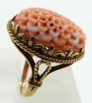 A 9ct gold ring set with a carved coral flower, 5.8g, size O/P