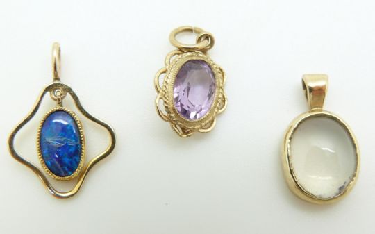 Six 9ct gold pendants including a Victorian cameo, moonstone, amethyst etc