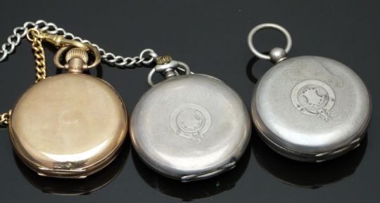 Three pocket watches comprising one gold plated keyless winding full hunter with inset subsidiary seconds dial, blued hands, black Arabic numerals, white enamel dial and 15 jewel movement, on gold plated chain, one Leicester & Co Twickenham silver open faced with inset subsidiary seconds dial, gold hands, black Roman numerals and white enamel dial and one silver keyless winding open faced with subsidiary seconds dial, blued hands, black Arabic numerals, white enamel dial and 7 jewel movement, on hallmarked silver chain, largest case diameter 51mm.