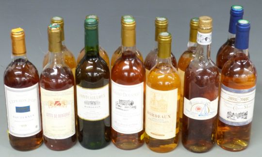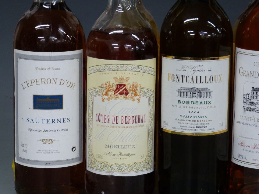 Thirteen bottles of French white and Moelleux wine. Six bottles of Bourdeaux Moelleux, L'Eporon D'or Sauternes, Cotes De Bergerac Moelleux, Chateau Grand Dousprat 2004, Les Vigniers de Contacailloux 2004, two bottles of Chateau Haut-Larrivat 2002, and Pineau des Charentes.