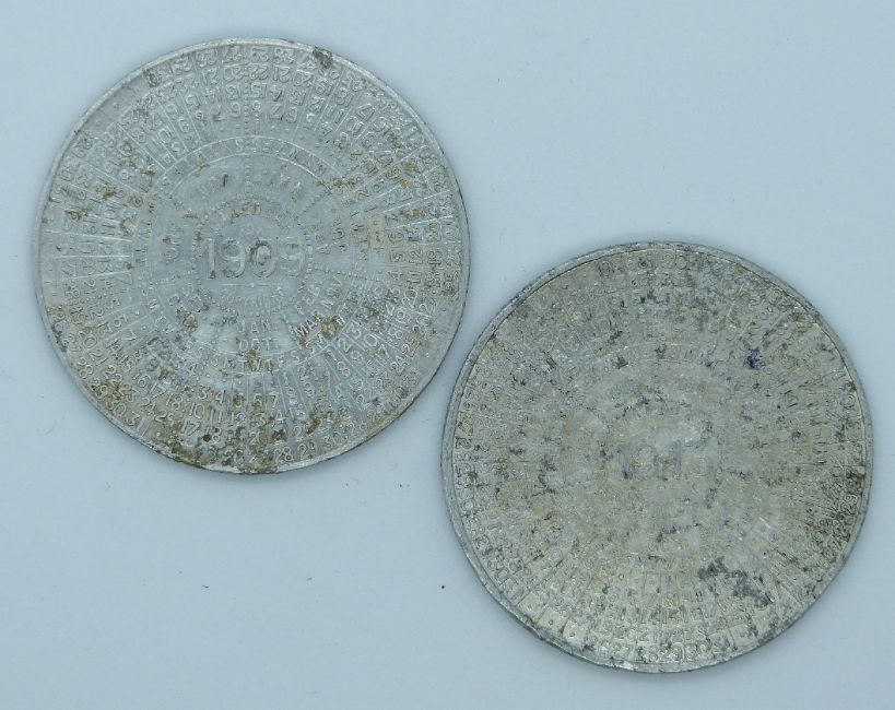 Matchless Metal Polish metal advertisement coin calendars for 1909 and 1913