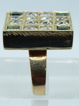 A yellow metal early 20thC ring set with old cut diamonds, each approximately 0.12ct and four rectangular cut Zimbabwean emeralds, 8.8g, size M/N