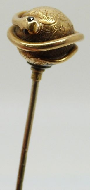 Victorian stick pin in the form of a snake wrapped around an engraved sphere