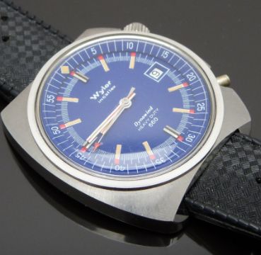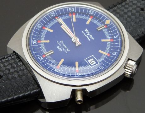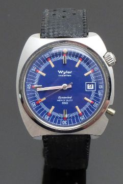 Wyler Lifeguard Incaflex Dynawind Heavy Duty 660 gentleman's automatic wristwatch ref. 4109 D-1338 with date aperture, red and white hands, blue dial and crown rotated bezel and stainless steel case, on black rubber Tropic strap, case diameter 39mm,
