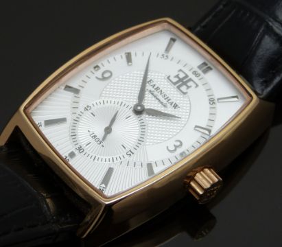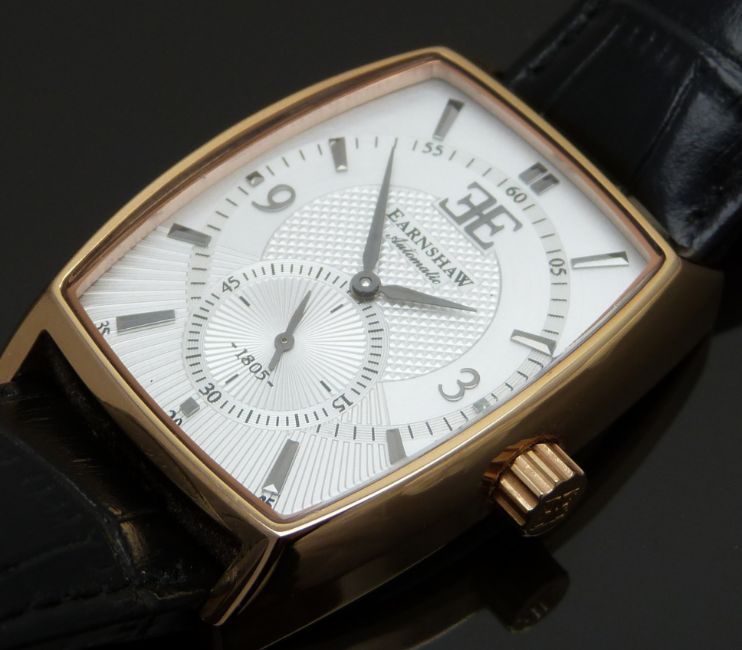 Earnshaw rose gold plated gentleman's automatic wristwatch ref. ES-8009 with subsidiary seconds dial, gunmetal hands and markers, silver dial, clear case back and unsigned movement, on black leather strap, case diameter 34mm.
