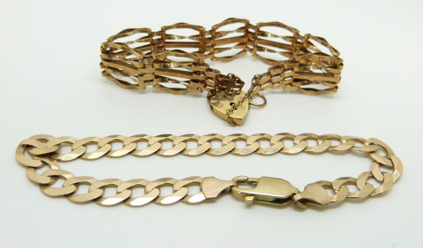 A 9ct gold gate bracelet with a heart padlock clasp and a 9ct gold curb link bracelet, 18g