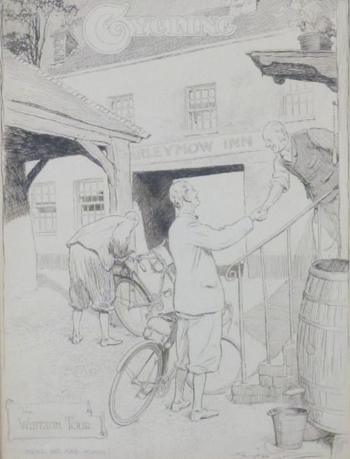 Frank Patterson (English 1871-1952): Pen and ink cover drawing for 'Cycling' magazine, 'The Whitsun Tour, here we are again at the Barleymow Inn', signed and dated 1928 to lower right, 39.5 x 29cm