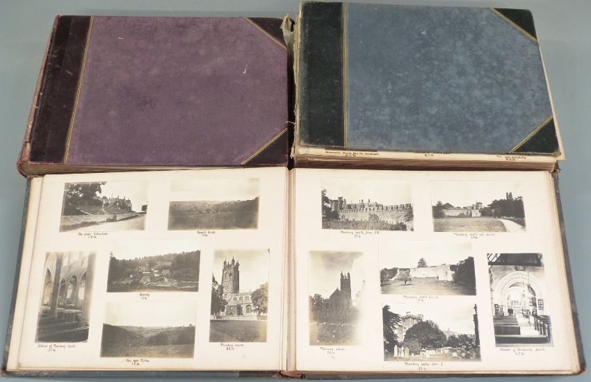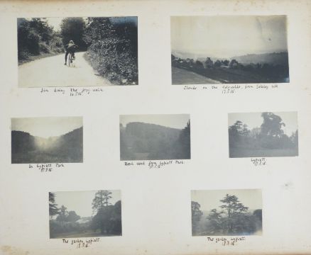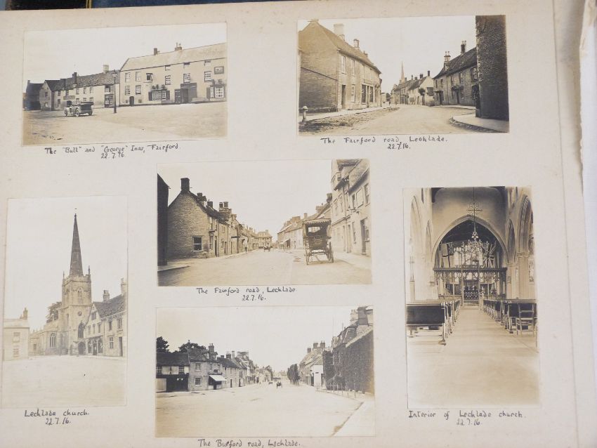 Five photograph albums compiled by Gerald Binns Drummond and his family of The Chantry, Bisley, near Stroud, Gloucestershire. Period covered is from 1910-1916 and includes multiple Gloucestershire / Cotswolds and wider UK scenes.Volume 1: family photographs at Bisley, cricket match at school, cutting the corn with heavy horses at Bisley x 3, Gloucester cattle, Morris Dancers and fiddler at Bisley, Lypiatt Park, Bisley Church x 4, GWR train entering and leaving Stroud station 1910 x 5, Captain Elwes hounds exercising at Bisley, multiple Bisley street views, Stonehouse quarry, The Bear at Bisley 1911, train entering Gloucester railway station, London scenes including King George in Hyde Park, soldiers on horseback in Hyde Park, Coronation procession photographs, Bisley and Eastcombe Boy Scouts, Severn Bridge, Sharpness, Berkeley Castle, church and railway station x 9.Cirecester and Kemble views including church, Market Place, railway stations aerial view, Cheltenham views, Cranham Potteries,  LNWR locomotives near Harrow, Hawley, Weston Super Mare 1912, Brean Down, Burnham, ships on the Parret at Bridgwater x 6, Sapperton and Daneway views, Deerhurst, Winchcombe and Sudeley views, Harrow, Perivale, Pinner, Denham etc.Volume 2: July 1913 - June 1914. This volume covers areas already covered in Volume 1 but with significant additions for Cotswold villages such as Bisley, Harrow, significant shipping, railway and aviation interest, Preston, Bisley, Cirencester, Winstone, Daglingworth, Syde, Westonbirt, Duntisbourne Rouse and Abbots. Welsh scenes including Cardiff, Penarth and Llandaff, Somerset Levels including Wedmore, Worle and Kewstoke ,Ilfracombe harbour, steam ships, Bleadon, Banwell, Minehead including harbour, Dunster, Taunton, Newquay, Devon coming into Ilfracombe, Clifton Zoo, Miserden, Rodmarton, Coates, Elkstone, North Cerney, Beverstone, Great Witcombe, Siddington, Amberley, Bibury, Barnsley, Brimpsfield, Lower Lypiatt, Chewton Mendip, Wells, Glastonbury, Cheddar, Porlock including harbour with ships, Lynton, Lynmouth, Dulverton, Clovelly, Bideford, selection of Rickmansworth including canal, biplane and monoplane at Hendon 11-6-14Volume 3: July 1914 - April 1915. This volume has further interesting street views of Bisley and surrounding villages, excursions to Scotland, Lake District and London, two interesting photographs of Gunboat Smith in Peterborough. Bussage, Chalford, Oakridge and Througham, Thornbury, Barnwood, Gloucester views, Standish, GWR and Midland Railway pictures, Newton Stewart, 20-25 HP Studebaker car, Wigtown, Mossyard, Port William, Loch Skerrow, Threave, Loch Trool, multiple Scottish topographical views, Northleach street views, Oakridge, Welsh views including Monmouth, Raglan, soldiers at Chalfond St Peter, more Bisley views including Catswood Farm, locomotives in Gloucester station, Stableford, Loughborough and surrounding area, Ashbourne, multiple Lake District including Dovedale, Haddon, Castleton etc.Volume 4: April 1915 - April 1916. Castleton continued, Ashby De La Zouche, Beaconsfield, Tocknells House near Cranham, multiple Lypiatt views, Coln St Dennis, Coln Rogers, Ablington, Owlpen, Gloucester including docks views, Somerset and Quantocks views, RFA sports and parading at Exeter 1915, Cherington, Tetbury High Street, Pinbury Park, Frocester, TewkesburyVolume 5: 1916 onwards. Burford, Fairford and Lechlade street views, lots of London scenes, multiple Alfriston, Brimpsfield, Stow-on-the-Wold etc. Last entry 27-7-17. Please see next lot, 602 for key and ephemera relating to The Chantry, Bisley