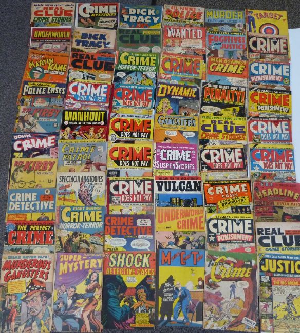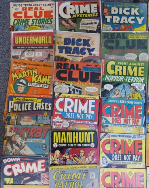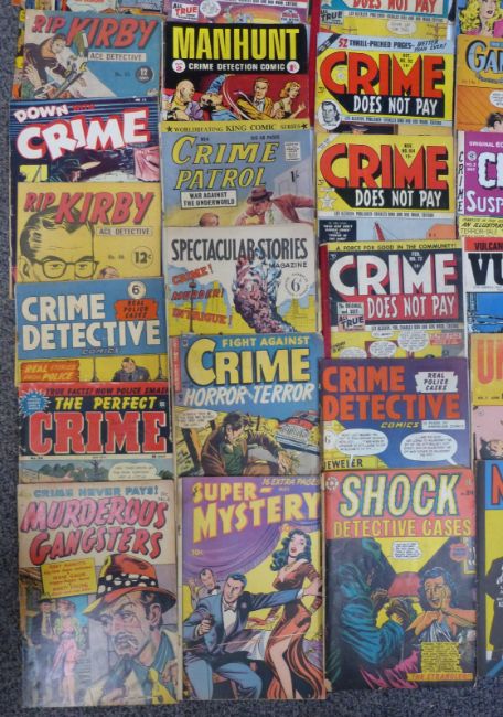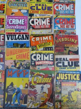 Fifty-five various crime and detective comics including Down With Crime, Crime Detective, The Perfect Crime, Murderous Gangsters, Crime Mysteries, Rip Kirby, Real Clue Crime Stories, Underworld, Martin Kane Private Eye, Authentic Police Cases, Fugitives From Justice etc.