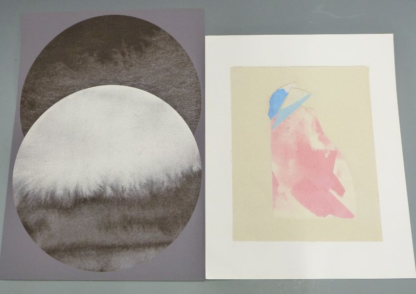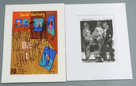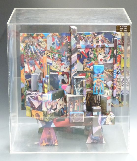 R Nichols modern abstract 3D sculpture in perspex display case, label to front reads 'R Nichols Opus 2094 Oct 2004', width 44cm together with various modern art prints including Collywood tower block, Peter Joseph limited edition print, David Hockney interest print etc