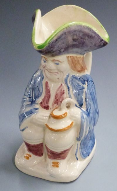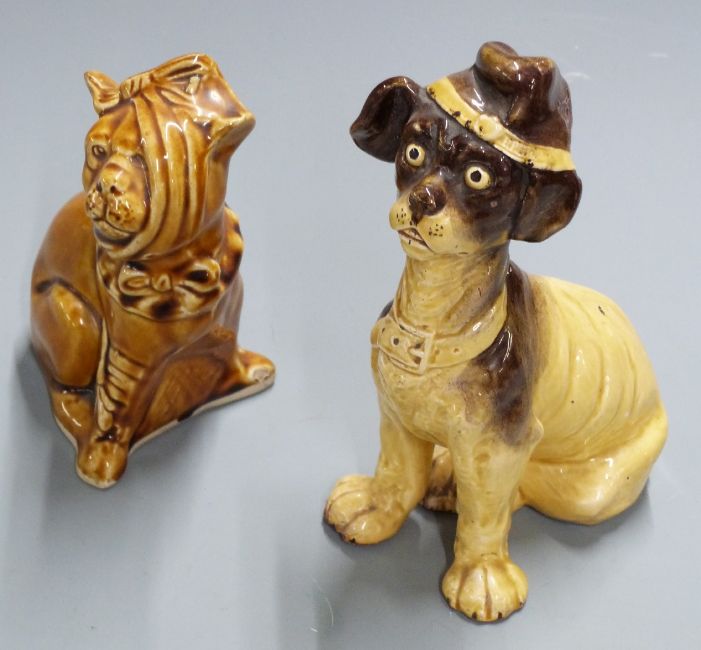 Brannam pottery Toby jug, Bretby or similar pottery cat with glass eyes, Brannam porringer and pottery dog figures, tallest 23cm