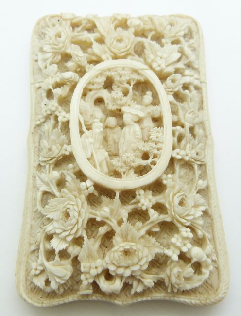 A 19thC Chinese deeply carved ivory shield-shaped card case decorated with chrysanthemums, figural cartouche to the face and court scenes verso, 11 x 7cm