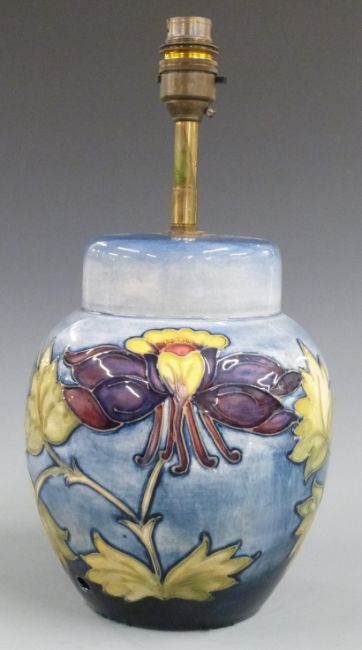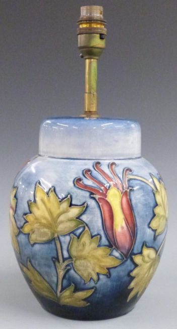 Moorcroft table lamp decorated in the Orchid pattern on a pale blue ground, H34cm