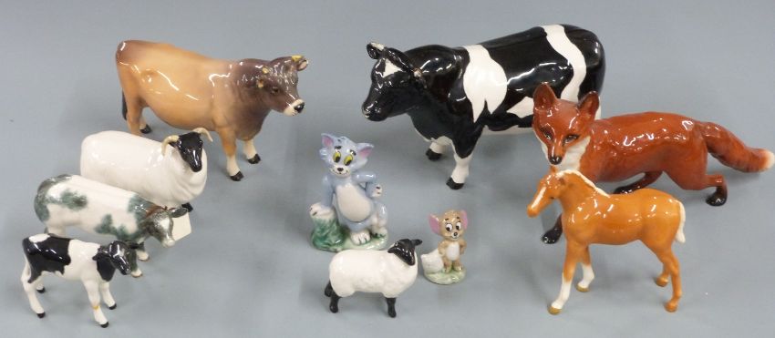 Beswick sheep, Friesian and Jersey cattle, Border Fine Arts Belgian Blue calf, Wade Tom and Jerry, large fox etc