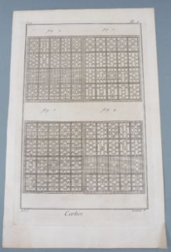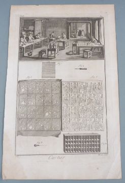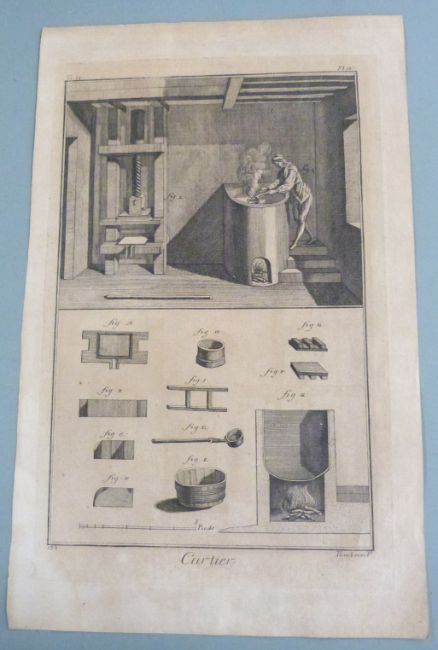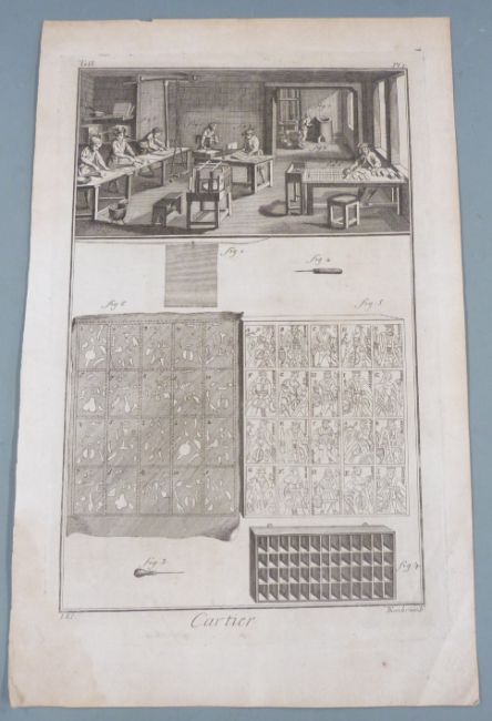 Six engravings depicting the process of producing playing cards including etching, cutting and workshop views