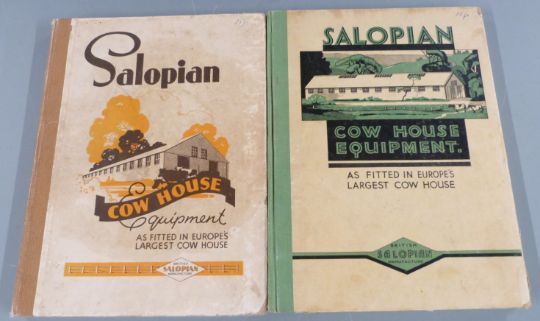 [Trade Catalogues] Salopian Cow House Equipment, Fittings & Fixtures catalogues, Farm Machinery and Implements from the Salopian Cattle Bowl Company (Shropshire) fully Illustrated catalogues for 1939 and 1950 with price lists, cloth backed illustrated boards
