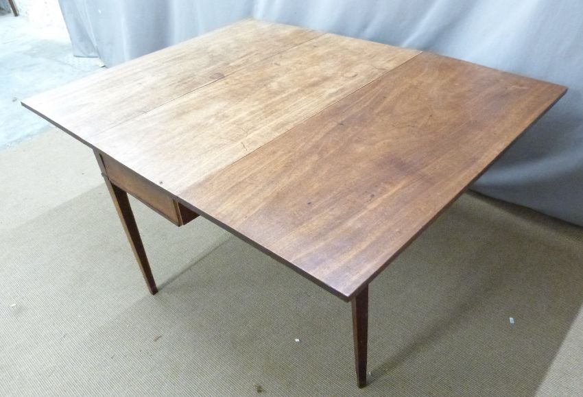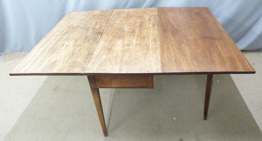 A 19thC mahogany drop leaf three plank table raised on tapering legs, W122 x D155 x H72cm