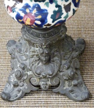 An earthenware oil lamp with frilled glass shade, H 62cm