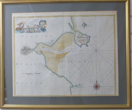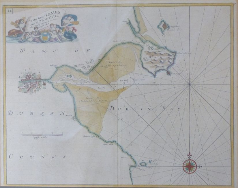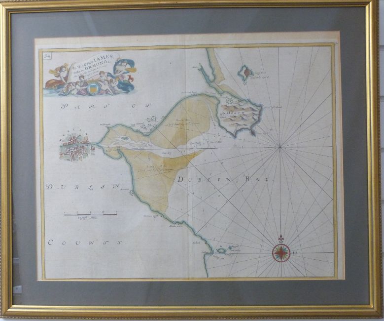Capt. Grenville Collins (1643-1694) hand coloured map or shipping chart of Dublin Bay, 46cm x 56cm