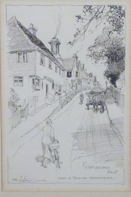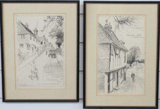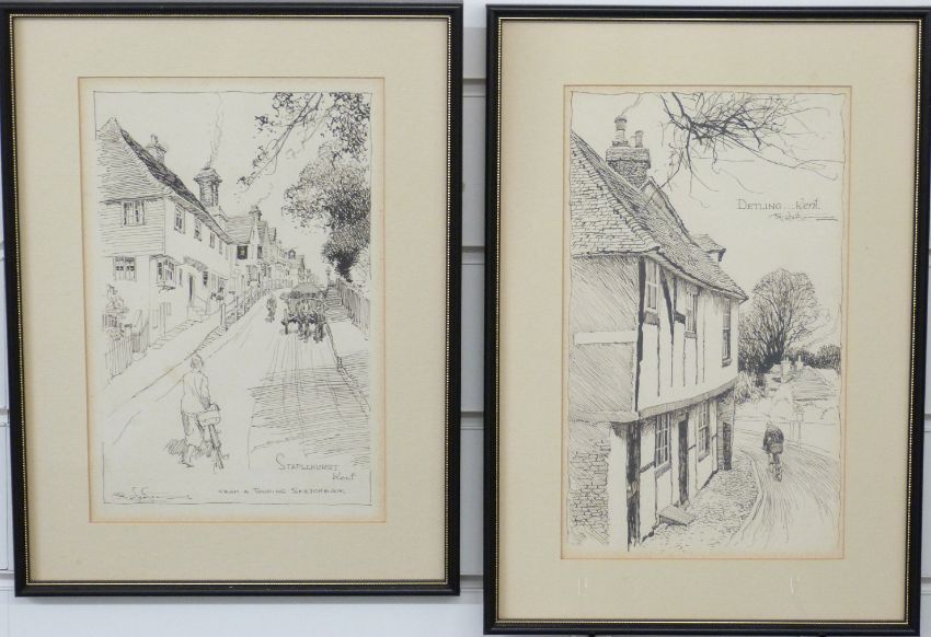 Frank Patterson (British 1871-1952): Pen and ink cycling related drawings 'Staplehurst, Kent' and 'Detling', both signed and 27 x 17cm