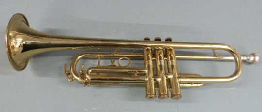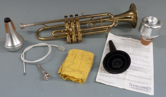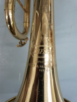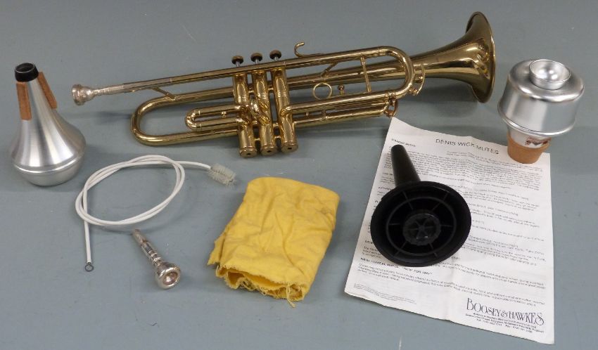 Lafleur brass trumpet stamped 'imported by Boosey & Hawkes London' complete with spare Vincent Bach mouthpiece, three mutes etc, in hard carry case