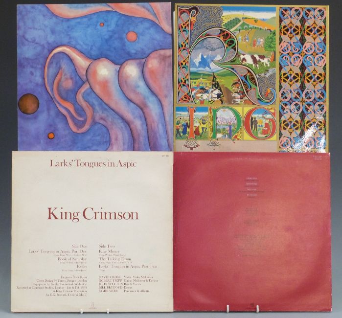 King Crimson - In The Court Of The Crimson King (ILPS 9111) pink rim / palm tree, Lizard (ILPS 9141), Larks Tongue In Aspic (ILPS9230) and Discipline (EGLP49), records and covers generally Ex/Ex