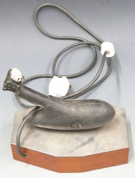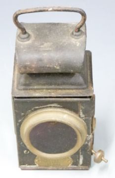 A part from a Lancaster bomber mounted on a plinth made into a lamp, vintage lights, keys, silver mounted bottles, military badges, pen knives, watches, enamel 'Derv' sign, fish spear etc.