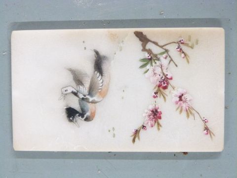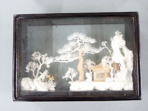 A group of Chinese collectable comprising an early 20thC Shibayama panel, soapstone vase, cork scene, hardstone book ends and hand painted panel on stand