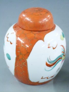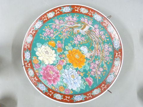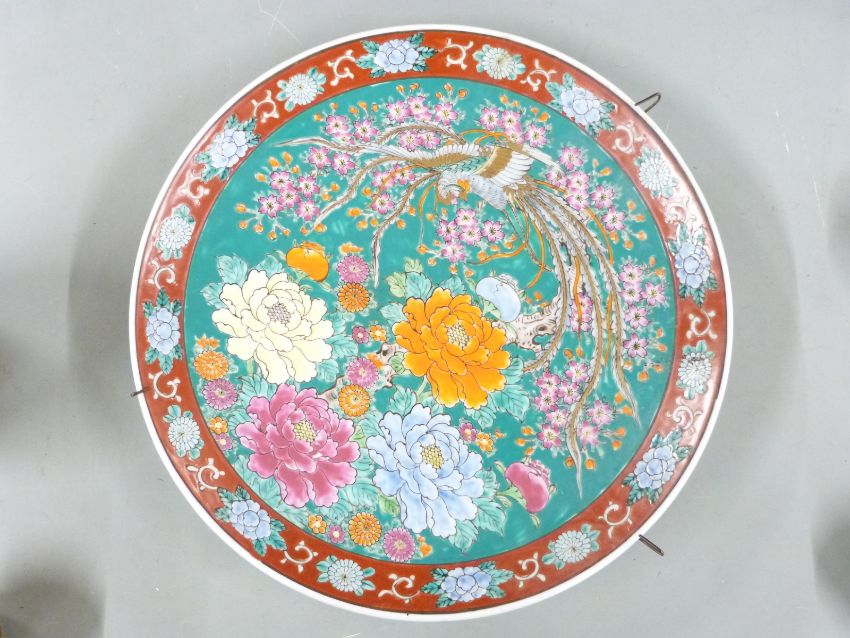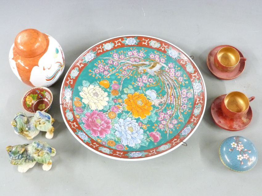 Japanese charger with marks to base, two cloisonné items, two Japanese lacquer cups and saucers, Japanese ginger jar and a pair of Foo dogs