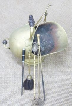 Five copper and brass coal scuttles, additional jam pans, watering can, kettle etc, tallest 53cm