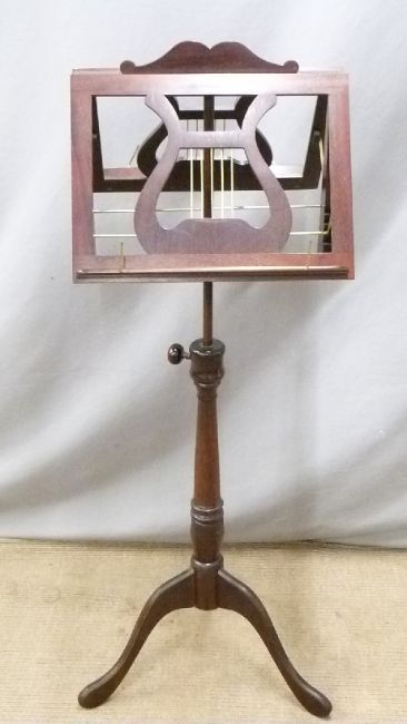 A mahogany duet music stand with fretwork lyre decoration, raised on an adjustable turned support and tripod base, H133cm