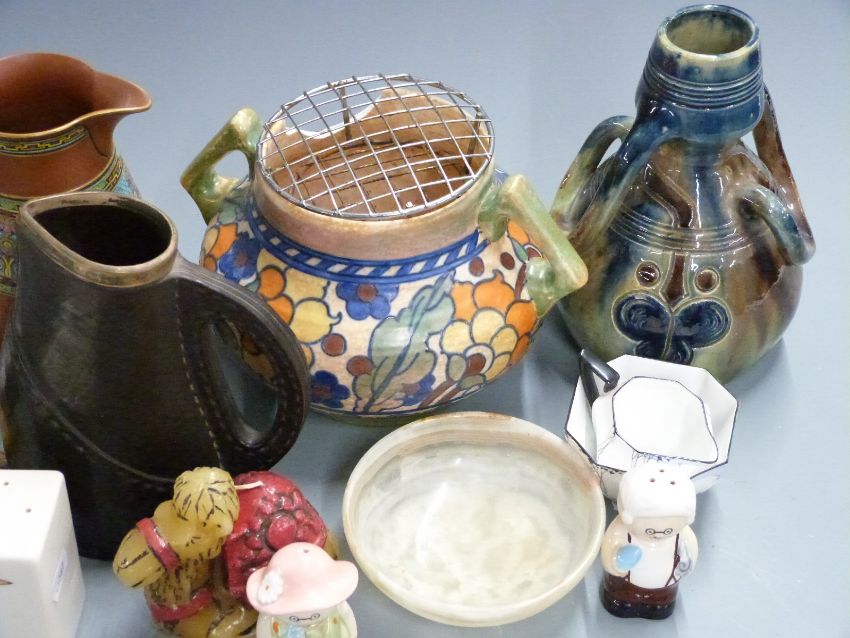 Charlotte Rhead Crown Ducal twin handled jardinere, Doulton leather effect jug, Irish Mist Whisky advertising figure, Art Deco Shelley milk jug and sugar bowl, pattern no 11604, possibly Linthorpe vase etc, tallest 47cm
