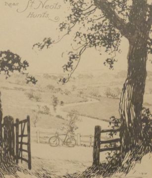 Frank Patterson (British 1871-1952): Two pen and ink cycling related drawings, 'The Lamb Inn, Eastbourne' and 'near St Neots, Hunts', both signed and dated 1924 and 1918, larger 26cm x 13cm