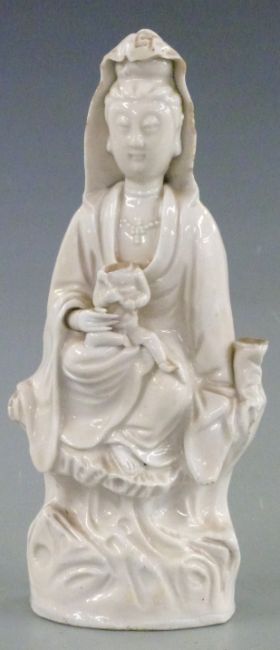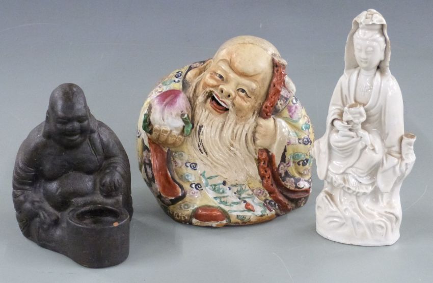 19thC/20thC Chinese polychrome figure of a laughing Buddha, terracotta figural censer and a blanc de chine figure of Guanyin, tallest 22cm
