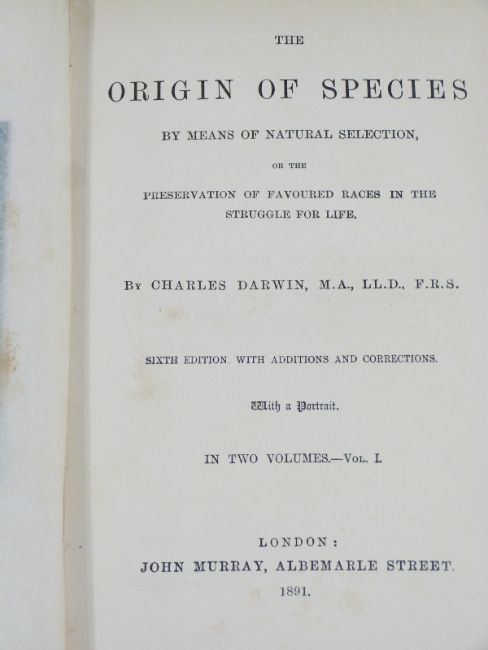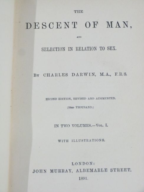 Charles Darwin The Origin of Species by means of Natural Selection or The Preservation of Favoured Races in the Struggle for Life, published John Murray 1891 in 2 volumes 6th Edition with Additions & Corrections, portrait & folding chart with The Descent of Man and Selection in Relation to Sex published John Murray 1891 in 2 volumes with illustrations – both works uniformily bound in contemporary half leather with raised bands and gilt titles & devices.
