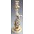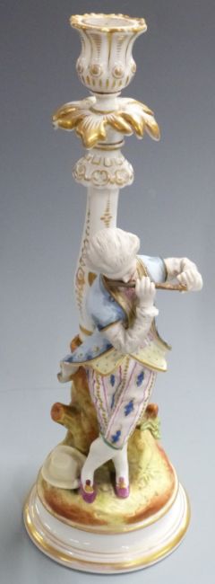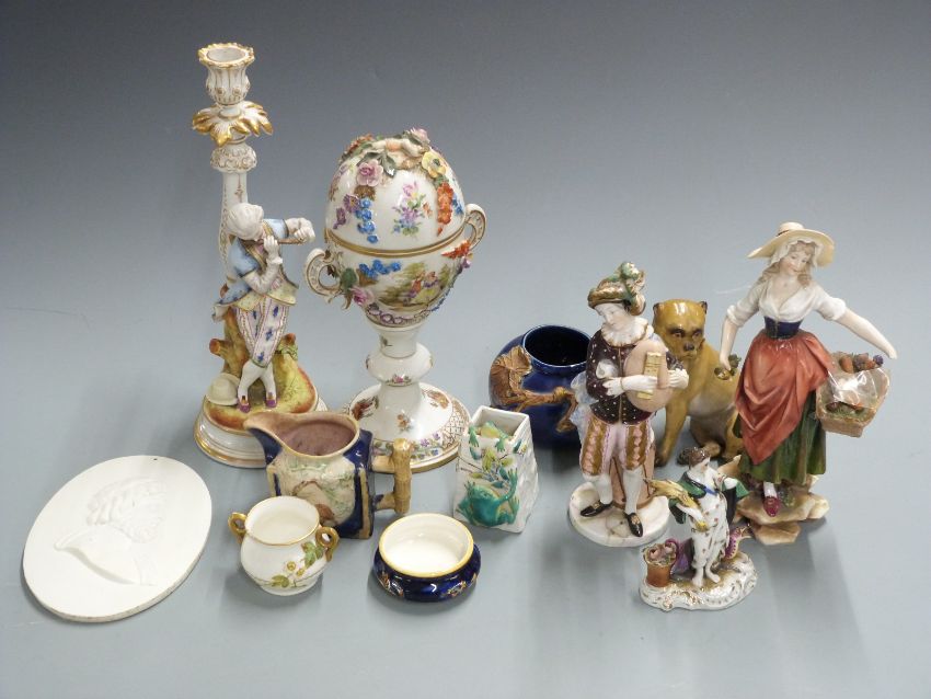 A collection of continental and majolica ceramics including a Dresden pedestal covered cup, figures, candlesticks, Copenhagen style plaque, pug dog etc, tallest 30cm