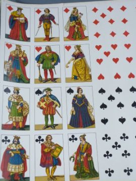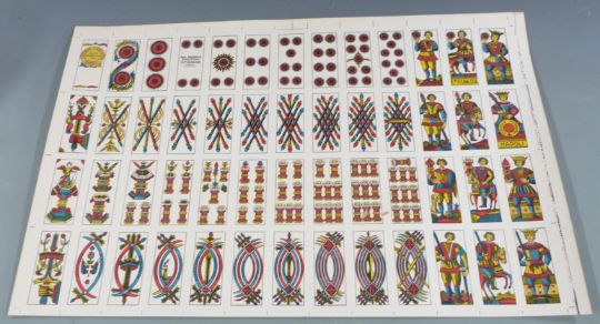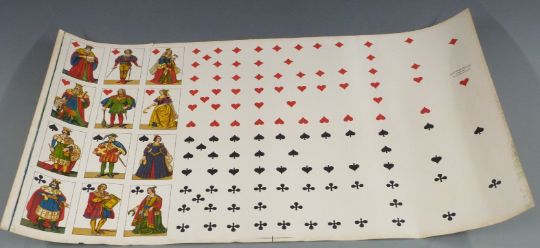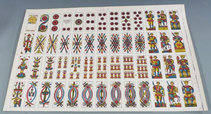 Various uncut continental playing cards, framed print, postcards relating to playing cards etc