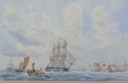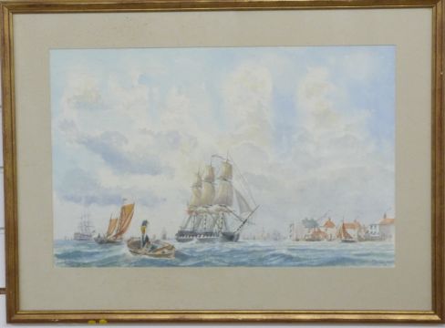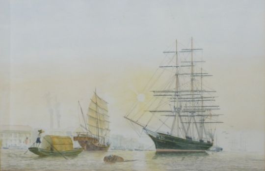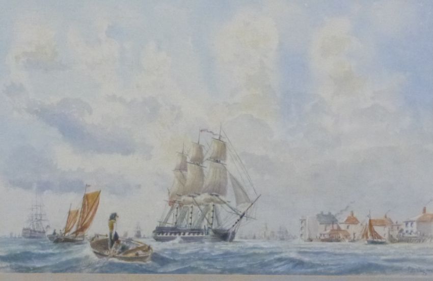 Two Peter Wall maritime watercolours, one 'Cutty Sark, Shangai, 1878' harbour scene, the other possibly HMS Victory at Portsmouth, one signed the other with label verso, larger 43 x 63cm