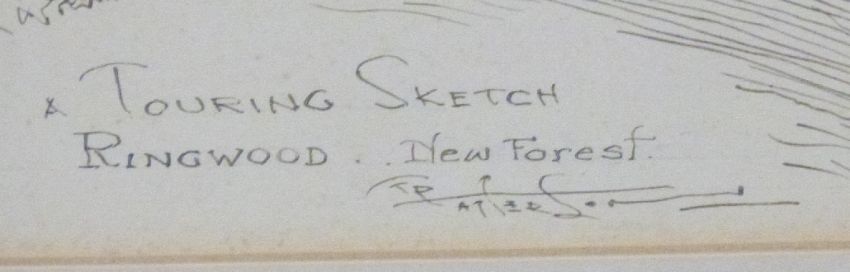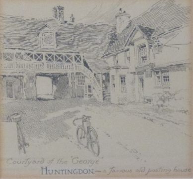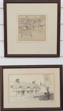 Frank Patterson (British 1871-1952): Two pen and ink cycling related drawings 'Courtyard of The George, Huntington' and a 'Touring Sketch of The Avon pub, Ringwood, New Forest', signed, 17 x 28cm