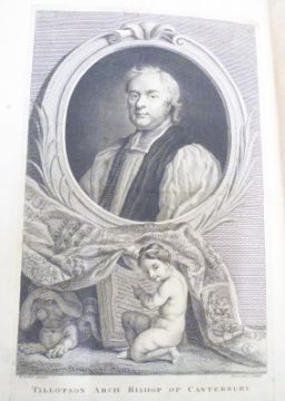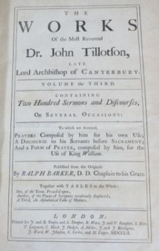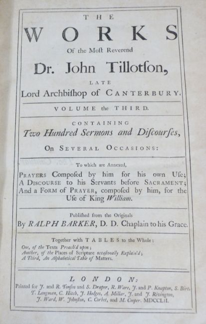 The Works of the Most Reverend Dr. John Tillotson, Late Lord Archbishop of Canterbury by Thomas Birch comprising volume the first with fifty four Sermons and Discourses together with The Rule of Faith, and volume the third containing Two Hundred Sermons to which are Annexed Prayers composed by him for his own use, A Discourse and a form of Prayer for the use of King William printed for J & R Tonson, S. Draper, R. Ware, J & P Knapton, S. Birt etc etc 1752 (lacking volume the Second) frontispiece portrait, bound in half leather over marbled boards (2)