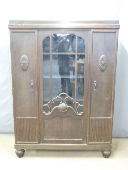 A 19thC glazed twin door display cabinet with adjustable shelves, raised on cabriole legs, W131 x D37 x H199cm