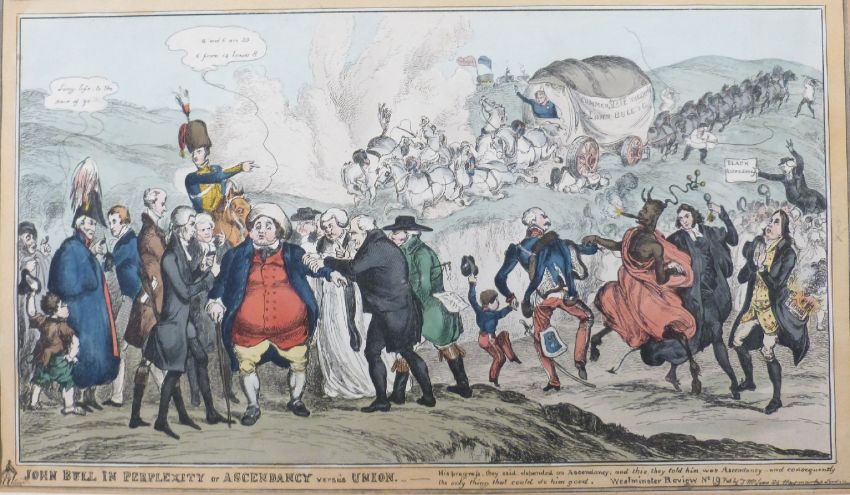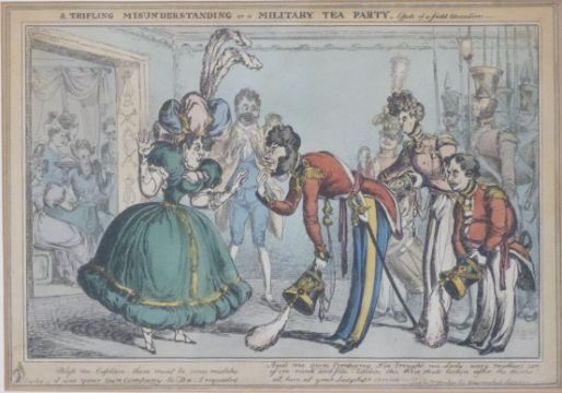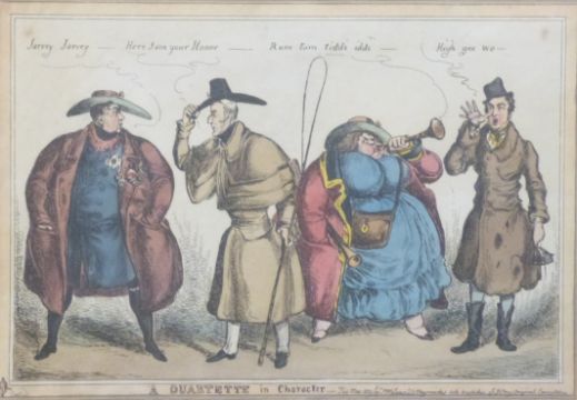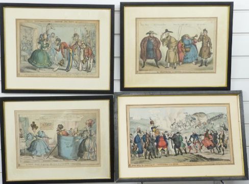William Heath (1795-1840): Four framed 19thC hand-coloured satirical etchings. Subjects include 'The New Way of Gaining Admittance to the Lady's Chamber', 'A Trifling Misunderstanding', 'A Quartte in Character' and 'John Bull in Perplexity', largest 26 x 45cm