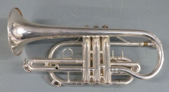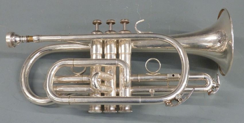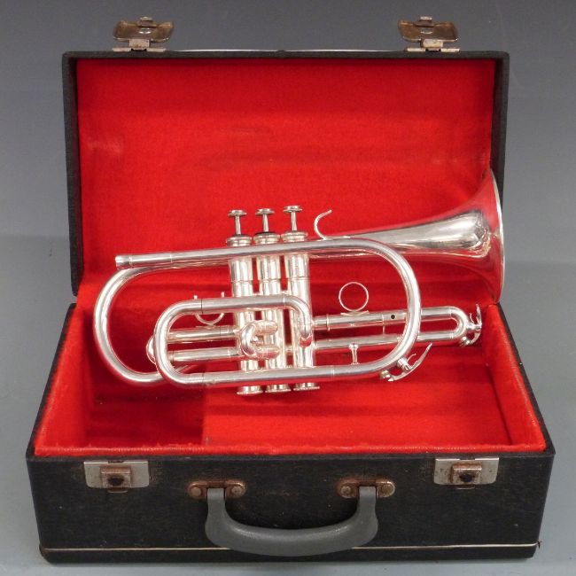 Virtuoso silver plated cornet with Vincent Bach mouthpiece, reg no CR-1705, in fitted hard carry case