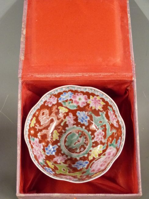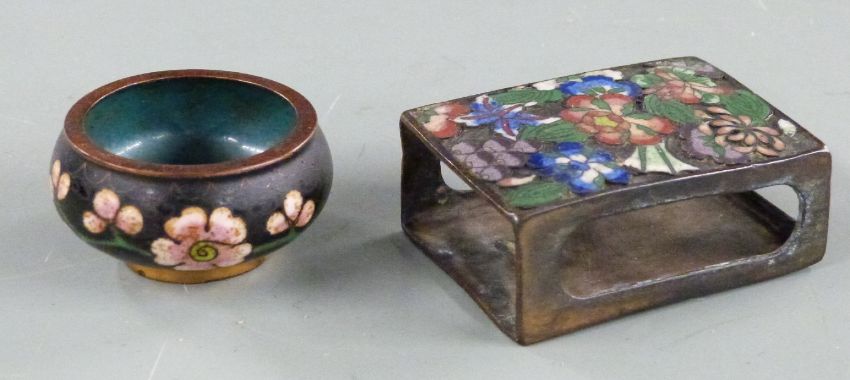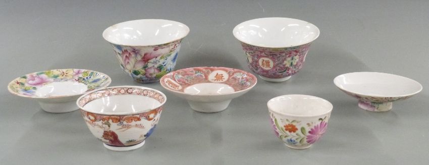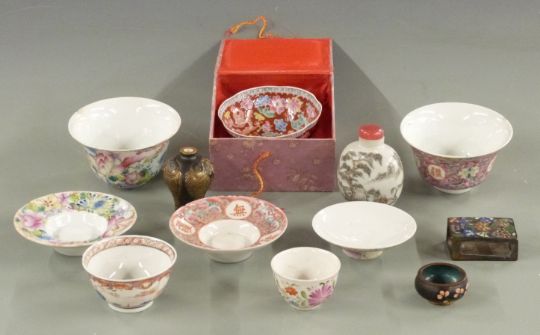 A collection of Chinese ceramics comprising two 19thC Chinese teabowls on bases each with four character marks to base, one with lid, three other tea bowls and a miniature vase decorated with fish, four character mark to base together with a scent bottle and cloisonné match box holder and salt