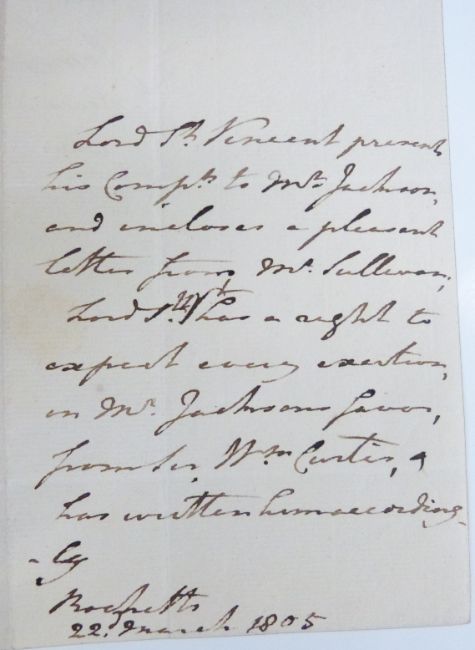 Admiral John Jervis, Earl of St Vincent 1734-1823: Hand written letter from Earl of St Vincent Admiral Jervis to John Jackson mentioning Mr Jackson, Sir ? Curtis and Mr Sullivan, dated 1805, 18 x 23cm, with a postcard of Jervis etc