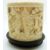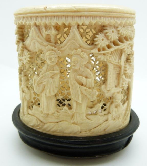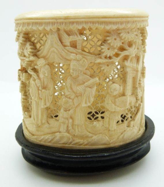 A 19thC carved Chinese ivory pot depicting figures on hardwood stand, 6.5cm