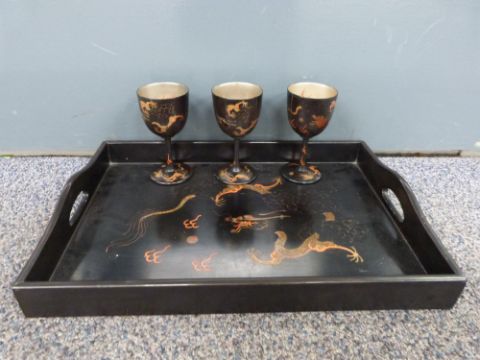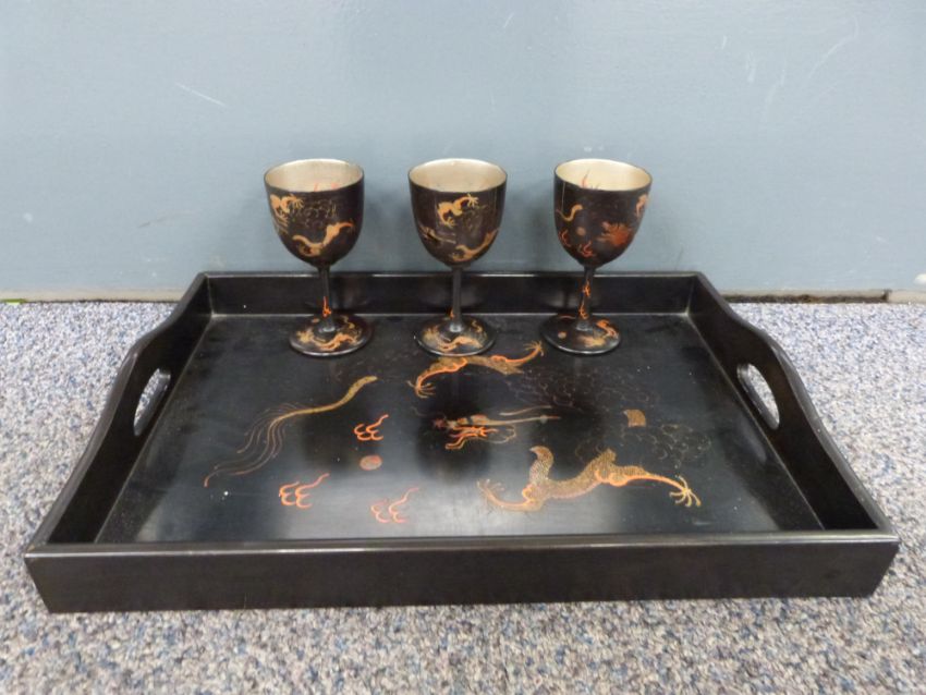 Ling king Anyukeeware Chinese lacquered tray and set of three cups decorated with gilt interior and dragon chasing flaming pearl.
