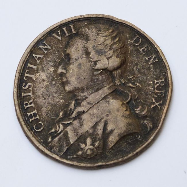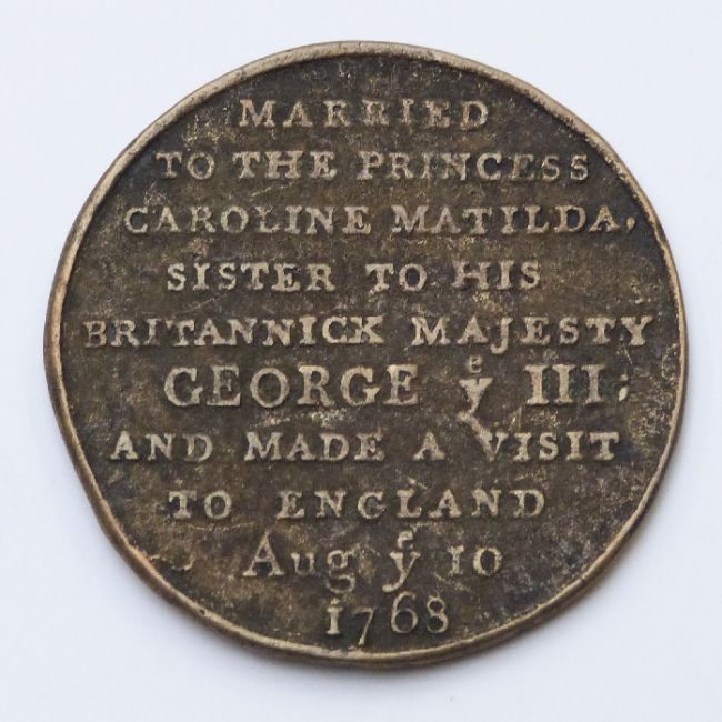 Christian VII of Denmark brass medal commemorating his visit to England August 10th 1768, diameter 36mm
